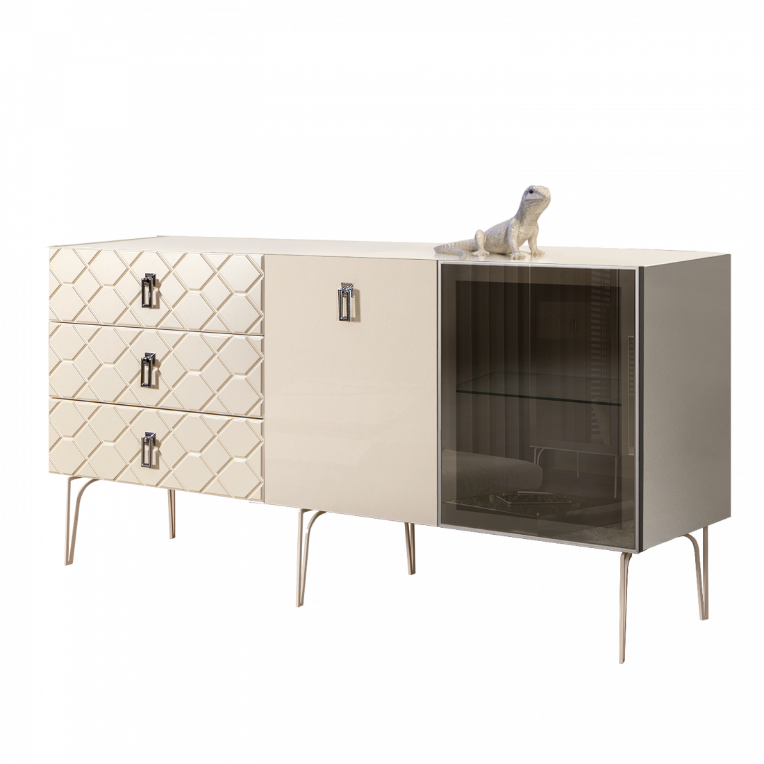 Стекло Stopsol меняет свои отражающие свойства под воздействием источников света. Поверхность, отражающая свет, мягко скроет содержимое вашего комода или витрины.